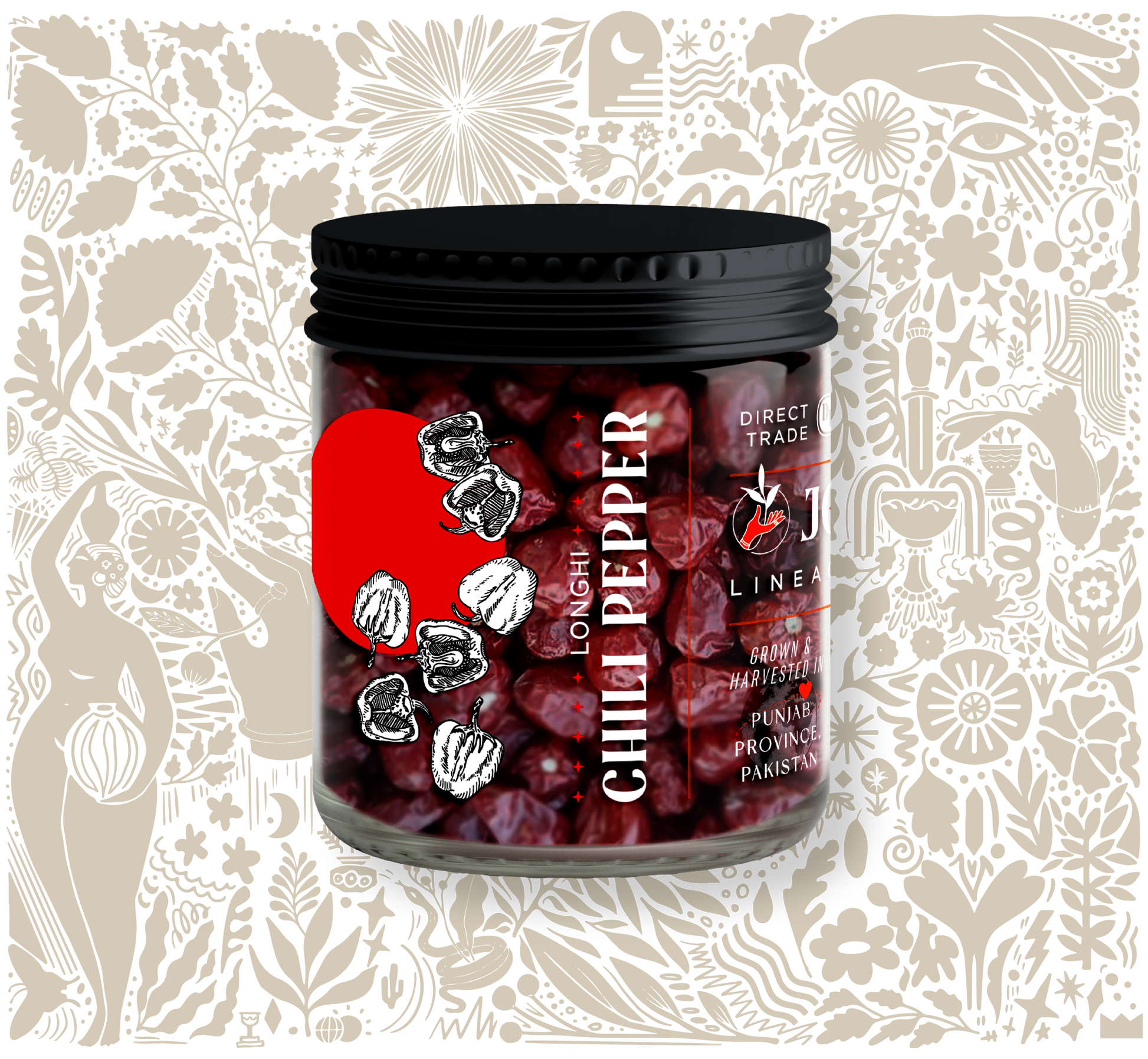 Our 100% Longhi Chili peppers are single origin and sourced directly from a farm that is located in the Mirpurkhas district of Pakistan. Mirpurkhas is one of the handfuls of districts supplying chilis to Pakistan’s infamous Kunri chili market (the largest of its kind in Asia), and they are specifically known for the production of Longhi chilis, the most prized chili varietal of the region. These small, round peppers have a vibrant red color and are full of pungent seeds. They are revered for their intense fiery sweet flavor and aroma. They are on par with Thai Birds Eye Chili and pack plenty of heat.